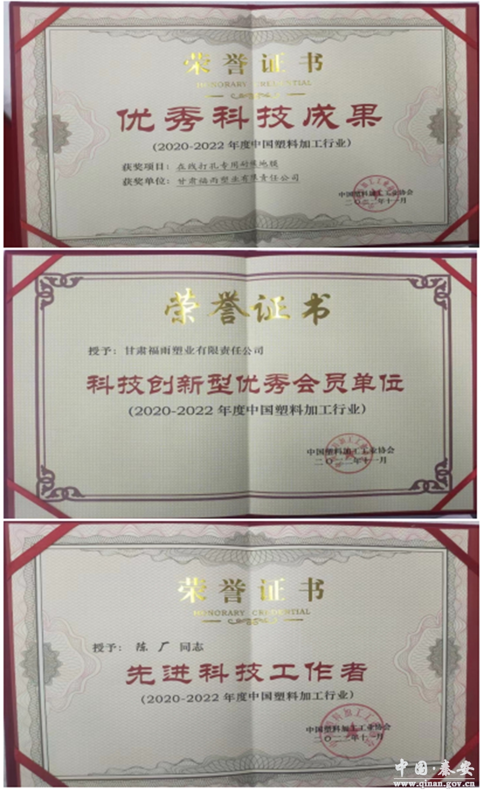 2月25日上午,由中国塑料加工工业协会主办的第五届中国国际塑料展暨塑料新材料、新技术、新装备、新产品展览会在南京国际博览中心开幕,政产学研各界代表近300人参加。展会同期,中国塑协还在南京举办第三届中国塑料行业科技大会及40余场专业会议,全面展示科技进步成果,谋划创新发展,指引行业方向。中国塑协对多年来在行业内做出贡献的企业和个人进行了表彰,甘肃福雨塑业有限责任公司荣获科技创新会员单位;参展的《在线打孔专用耐候地膜》荣获优秀成果奖;公司总经理陈厂荣获先进科技工作者称号。