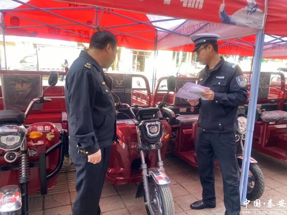 为深入落实道路交通安全“严管十条”工作要求,加大 “一盔一带”安全守护行动主题宣传力度,进一步提高辖区群众骑乘电动车、摩托车的交通安全意识,全面推进电动车源头隐患治理工作,确保广大群众出行安全。10月24日,秦安县公安局交警大队联合市场监督管理局深入辖区电动车售卖点开展“一盔一带”宣传及安全检查工作。