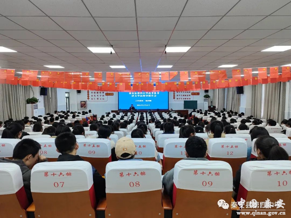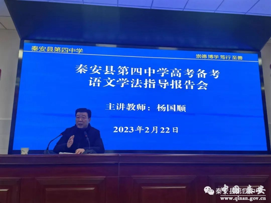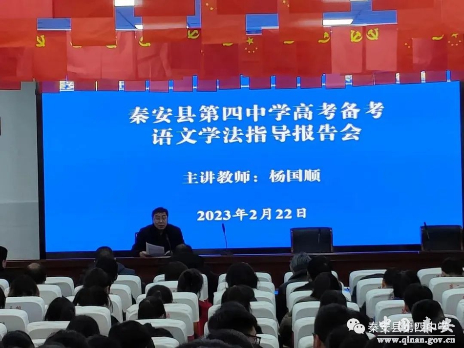 “任其事必图其效,欲责其效,必尽其方。”为了让高三学生尽快进入高考备考的角色,适应高三学习节奏,优化学习过程及方法,提高备考效率和能力,秦安县第四中学于2月22日举行了语文学科备考主题讲座,邀请了秦安县第一中学正高级语文教师杨国顺老师,针对2023年备考的新形势及高三学生在语文复习备考中普遍存在的问题进行学法指导,学校领导、语文教师和高三级学生300余人参加了本次主题讲座。