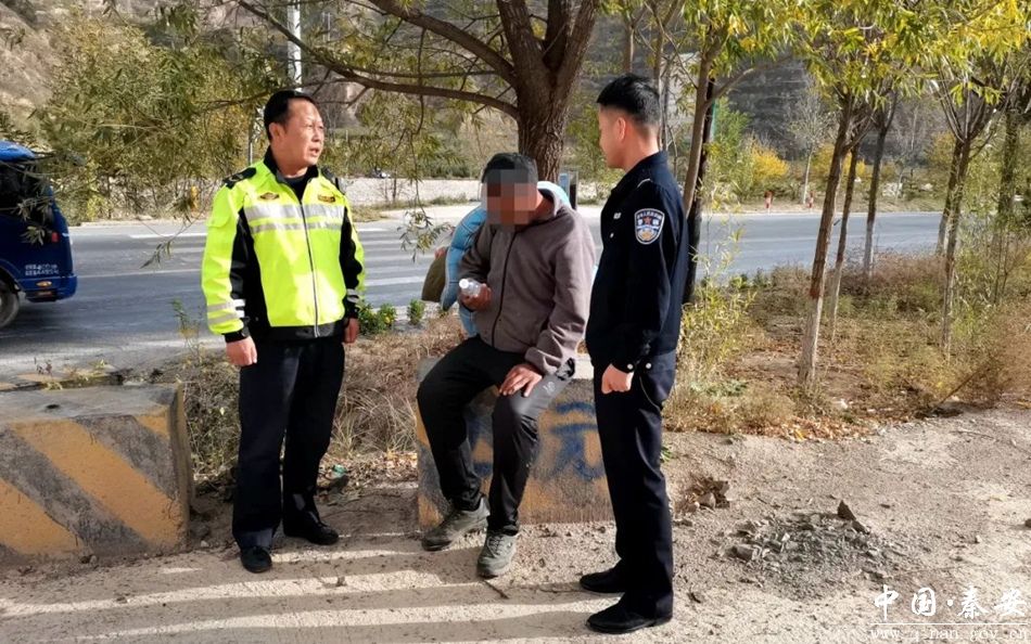 接警后,民警及时赶赴现场,发现一男子携带被褥行李,神情不定且体力虚弱,瘫坐在路边的护栏上。民警遂上前了解情况,经了解,该男子名叫次平(化名),藏族,系西藏自治区日喀则市通门县人,在乘车前往兰州市打工途中误下错站点至秦安县,因身上无钱购买车票,次平(化名)打算徒步行走至兰州市,由于一天没有吃饭加之近期气温骤降的缘故,在行走至秦安县安伏镇高速公路杨寺隧道口时因体力不支便瘫坐在了护栏上。