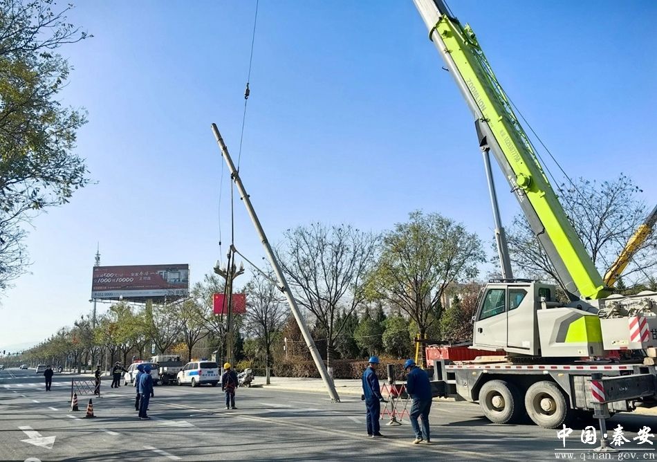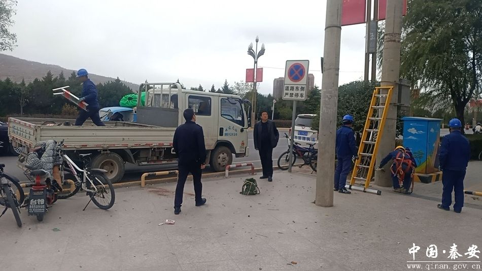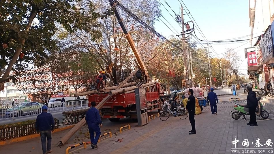 近日,秦安县执法局结合城区市容环境集中整治行动,联合交警、电信、移动、联通、广电、供电等相关部门,在前期大力整治空网的基础上,对城区内影响市容市貌、阻碍交通、存在较大安全隐患的废弃、废旧电线杆进行集中移除,在提升城区市容“颜值”的同时守护了群众出行安全。
