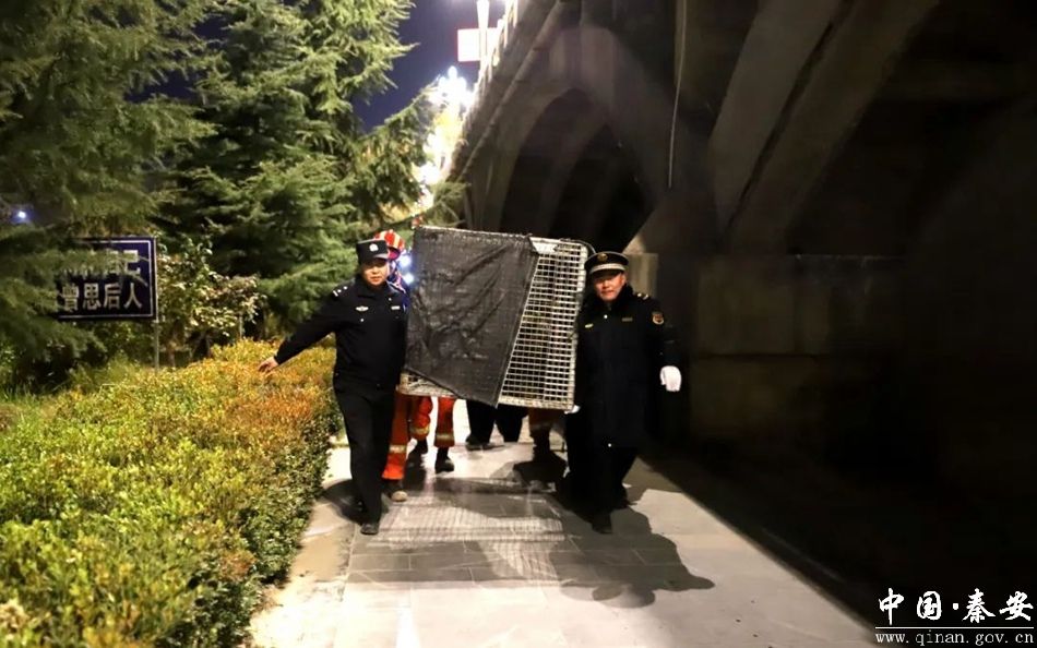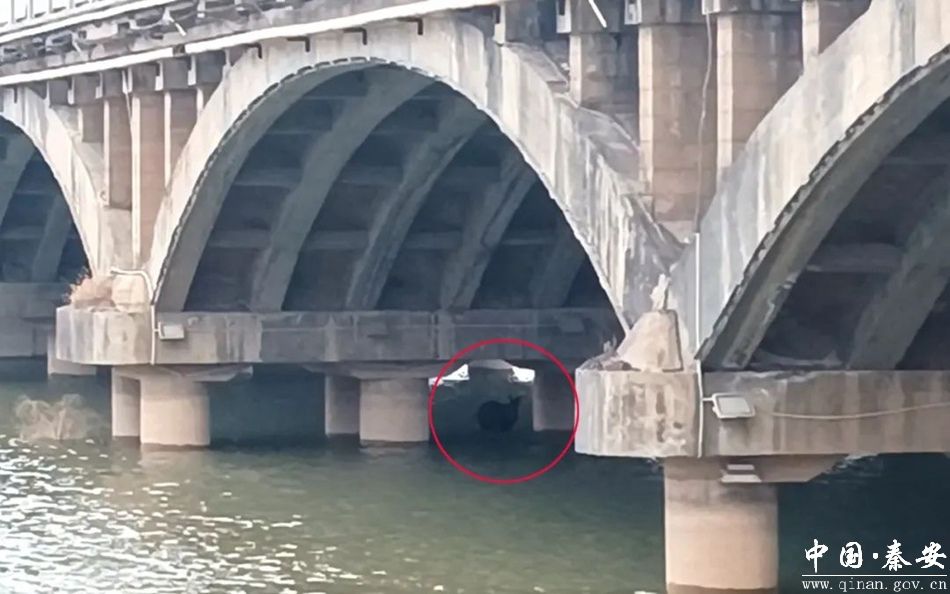 当天16时许,一位散步的热心群众报警称,在秦安县西大桥处发现一只野生动物,被困到河里了,要求出警救助。