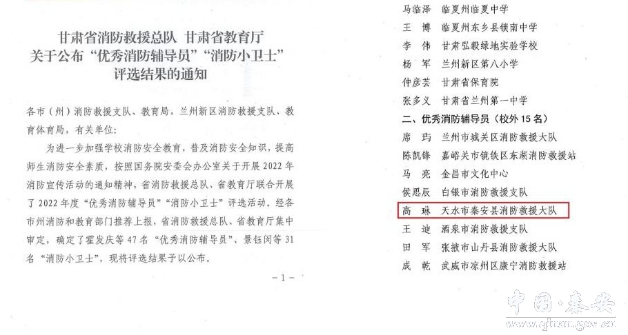 近日,甘肃省消防救援总队、甘肃省教育厅联合印发《关于2022年度“优秀消防辅导员”“消防小卫士”评选结果的通知》,秦安县消防救援大队高琳荣获“优秀消防辅导员”称号。