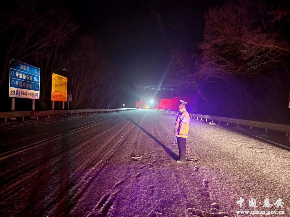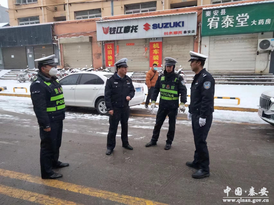 2月13日,秦安县辖区普降中雪。为全面做好雪天道路交通事故预防工作,最大限度降低雪天对交通安全带来的不利影响,秦安县公安局交警大队迅速启动恶劣天气应急预案,全警上路做好道路交通安全管理工作,为广大市民安全出行保驾护航。