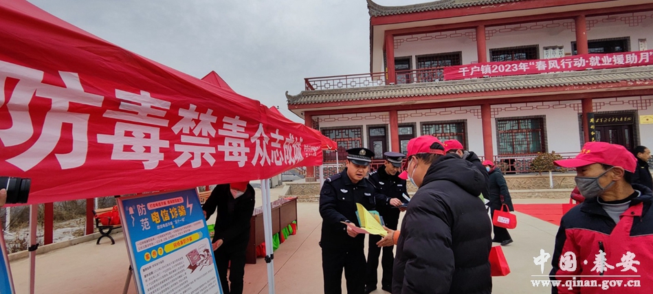 为进一步增强辖区外出务工人员禁毒、防范电信网络诈骗意识,不断增强辖区群众拒毒防骗和抵御邪教侵蚀的能力。2月1日,秦安县公安局千户派出所以千户镇2023“春风行动,就业援助月”招聘会暨外出务工人员欢送会为契机,在秦安县千户镇广场开展禁毒、防范电信网络诈骗宣传活动。
