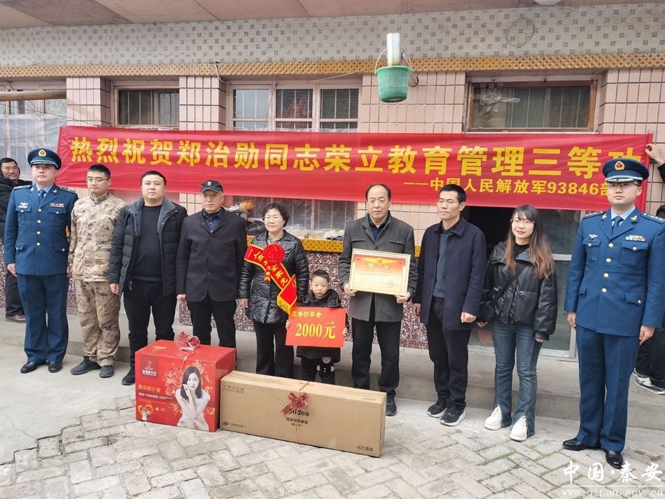 立功喜报,一头连着军人的士气,一头系着军属的牵挂期盼,既是对立功军人最大的肯定,也是对军属默默支持的一份回馈。1月29日,93846部队代表来到秦安县,同县人民武装部、县退役军人事务局、兴国镇退役军人服务站为该部队秦安籍现役军人郑治勋家属送去三等功立功喜报,在寒气袭人的冬日里为军人家庭带去了新春的祝福和满屋的喜气,也体现了党和国家对军人的尊崇和对军属的关爱之情。