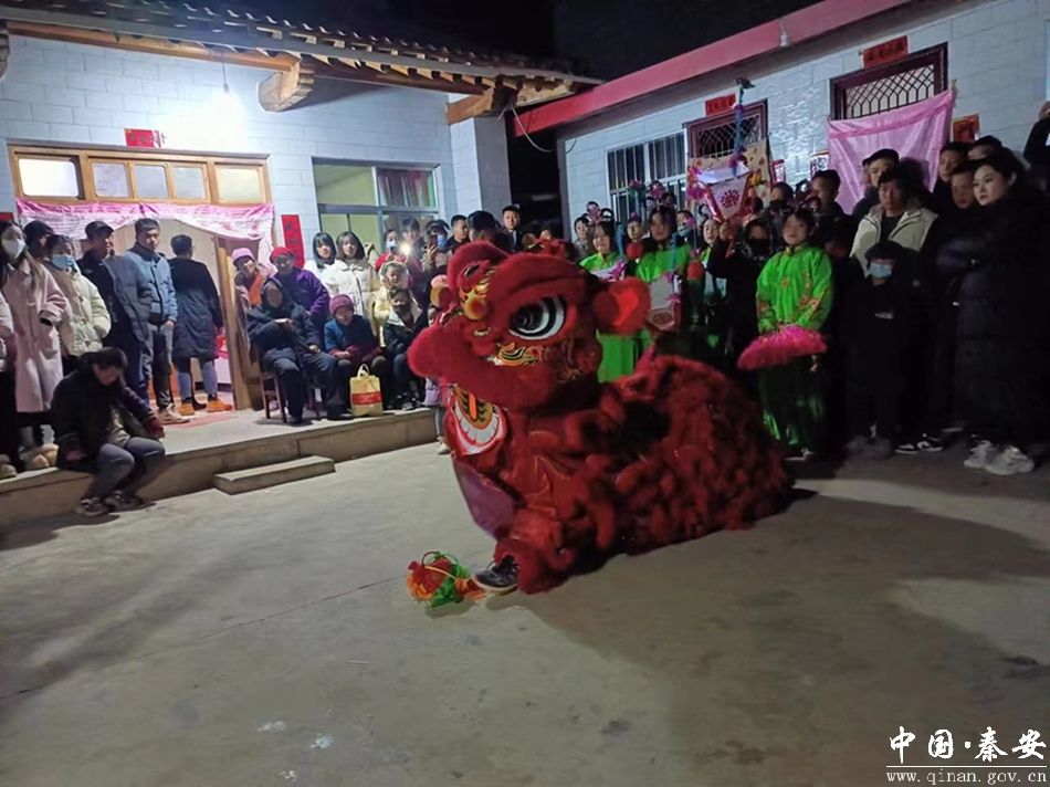 人未见声先至,喧天的锣鼓响彻街道村落,郭嘉村带来的社火表演中,队员们身着盛装,伴随着欢快的鼓点,舞起社火扭起秧歌,活灵活现的小狮子在大狮子的引领下来回舞动;各色花脸扮相的村民在队伍中步伐妖娆,在锣鼓助阵下尽展身手。锣鼓喧天的民间社火,承载着希冀来年风调雨顺、五谷丰登的美好祈愿,也彰显着绵延悠长的乡土艺术不断焕发的勃勃生命力。