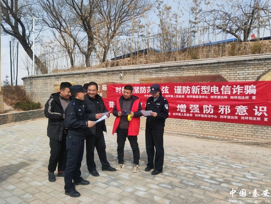 为进一步提高辖区群众防电诈、反邪教意识,保障居民群众切身利益,近日,刘坪镇综治中心联合司法所、派出所以“三八”妇女节活动为契机,在秦洼村广场开展防电诈、反邪教宣传活动。