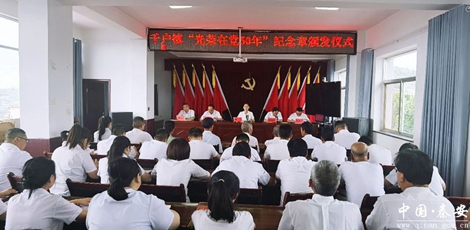 为庆祝中国共产党成立103周年,弘扬伟大建党精神,赓续共产党人精神血脉,进一步增强党员的荣誉感、归属感、使命感,在“七一”建党节来临之际,6月27日,千户镇举行庆祝建党103周年大会暨“光荣在党50年”纪念章颁发仪式。全体党政领导班子成员,各村党支部书记,部分党员代表、获得“光荣在党50年”纪念章的党员代表及家属共计50余人参加会议。