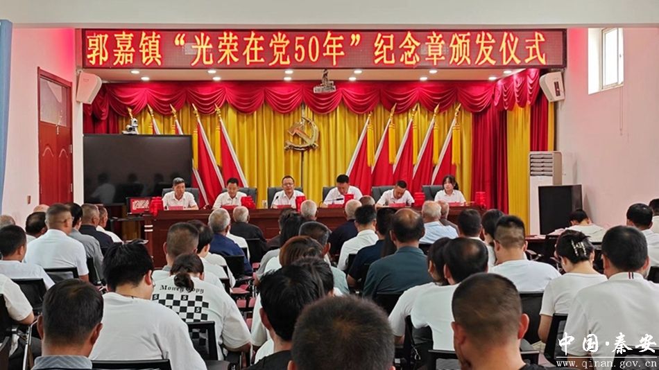 为庆祝中国共产党成立103周年,弘扬伟大建党精神,进一步增强党员的荣誉感、归属感和使命感,7月1日,郭嘉镇举行“光荣在党50年”纪念章颁发仪式。全体副科级以上领导,各村党支部书记,部分党员代表、获得“光荣在党50年”纪念章的党员代表及家属共计80余人参加会议。