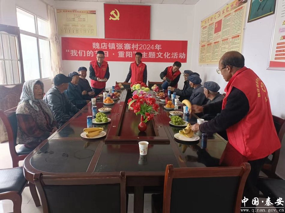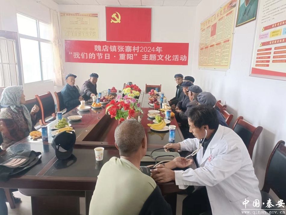 在张寨村新时代文明实践站,志愿者们为老人们准备了饼干、瓜子、水果等慰问品。镇中心卫生院的专业医生为老年人提供了把脉诊疗,测量血压等爱心义诊服务,为他们送去关怀和温暖。来参加活动的老人们纷纷表示,村里开展这样的活动非常有意义,作为张寨村的村民很自豪,很有归属感。在陇滩村新时代文明实践站志愿者向前来参加活动的老人们介绍了重阳节的传统习俗,如登高祈福、赏菊、饮菊花酒、佩茱萸等,使现场沉浸在浓厚的重阳节氛围中。随后,志愿者们为他们送上水果、寿饼等慰问品,祝老人们节日快乐,身体健康,并叮嘱他们,秋冬季节天气变化,要注意保重身体。