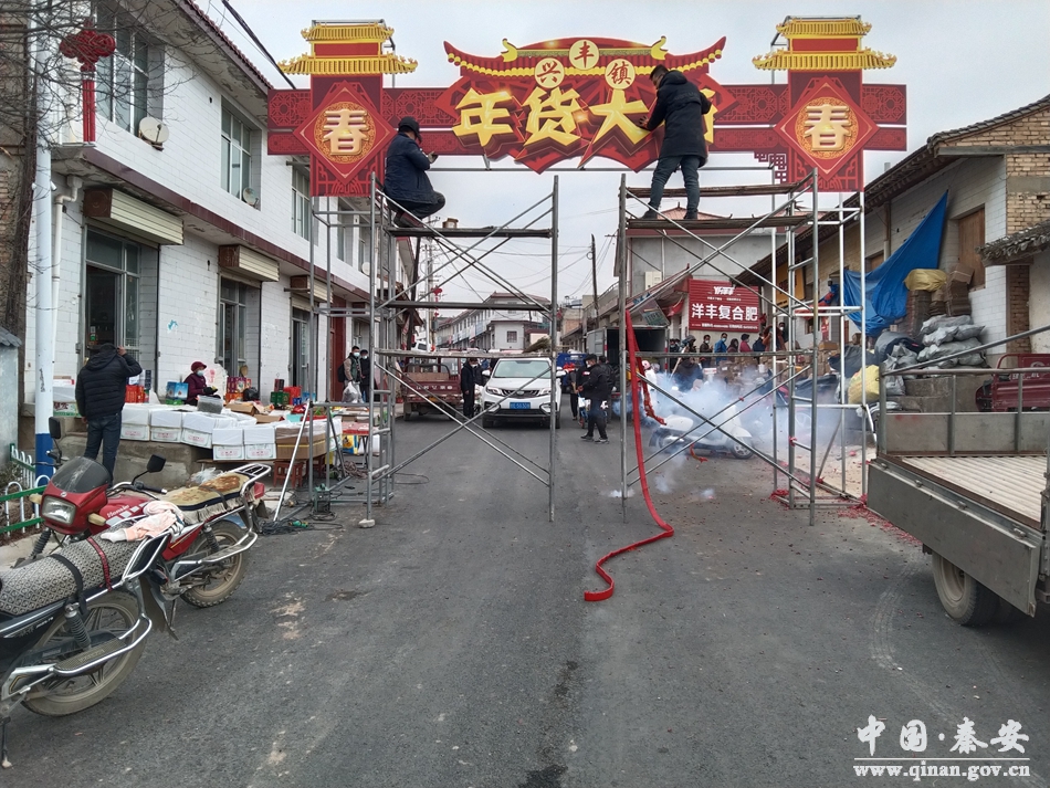 按照《秦安县春节“嘉年华”暨2023年年货促销活动》文件要求,近日,兴丰镇党委、镇政府及时安排部署,坚持“以人为本”的理念,充分尊重群众的意愿和要求,合理规划、科学布局,做到有序经营、规范管理,划街归市,在兴丰村主街道两侧设置了一条长约800米的临时年货街,方便群众集中采购年货。