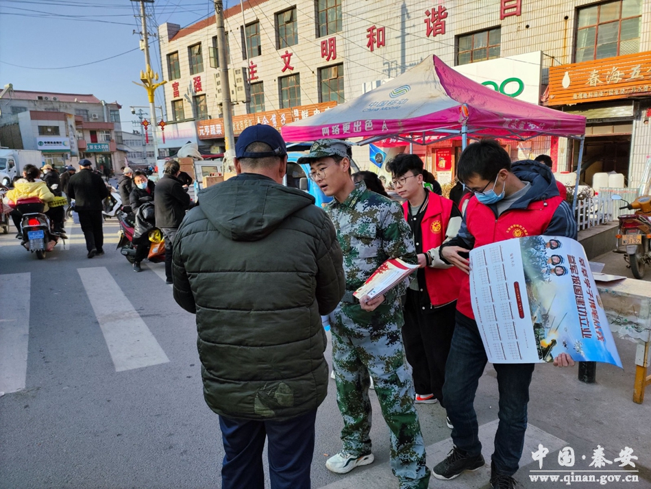 宣传小分队先后到镇街道超市、年货市场等人流密集场所,发放征兵宣传手册308份、宣传海报120张,同时向青年和家长面对面讲解征兵报名方式、标准条件、优惠政策,提高适龄青年对大学生征兵条件和优惠政策的知晓度,鼓励适龄青年积极响应祖国号召,把个人成长和祖国的需要连在一起,号召广大高学历青年踊跃报名参军。