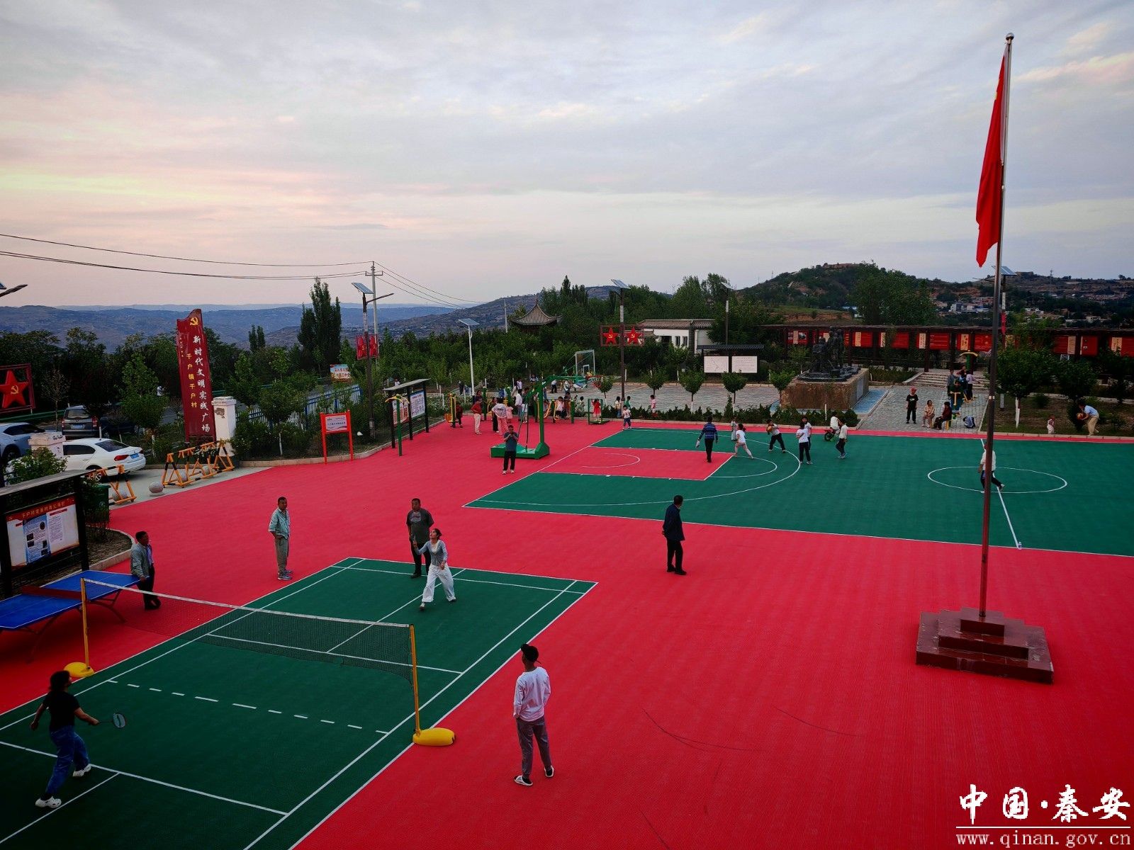 如今,崭新的健身器材整齐排列在广场一侧,配备了双位坐蹬训练器、太极揉推器、漫步机等健身器材,排球场、羽毛球场、篮球场等运动场地一应俱全,满足了不同年龄段村民的健身需求。自投入使用以来,广场人气飙升,村民们在劳作之余纷纷前来锻炼,孩子们在一旁嬉笑玩耍,充满了生活气息。
