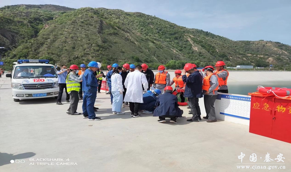 演练分火灾施救演练和水库落水救援演练。预演建筑区内某位置发生火灾,施工人员立即停工进行紧急有序疏散,消防人员、医疗救护人员在接到指令后,第一时间赶往火灾现场展开扑救救援,熟练操作使用消防设施,迅速把明火扑灭;预演发现水库落水人员后利用救生圈第一时间迅速进行施救,进行现场抢救救援。