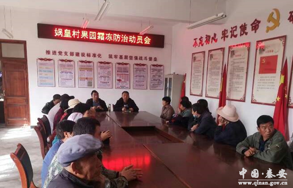 结合本村果园实际情况进行果园管理实用技术培训,主要围绕起垄覆膜小沟灌溉、清园、幼树刻芽、花前复剪、疏花疏果等技术措施为果农进行培训。并根据秦安县气象局发布的霜冻预报,及时通过本村村民微信群、大喇叭等方式发布霜冻预报及果园熏烟、喷施防冻剂等防治措施。同时,娲皇村驻村帮扶工作队组织本村果农在村委会开展果园管理和霜冻防治工作,并现场进行冻害调查及数据统计和上报,组织本村果农进行自救工作,使受害率降到最低。