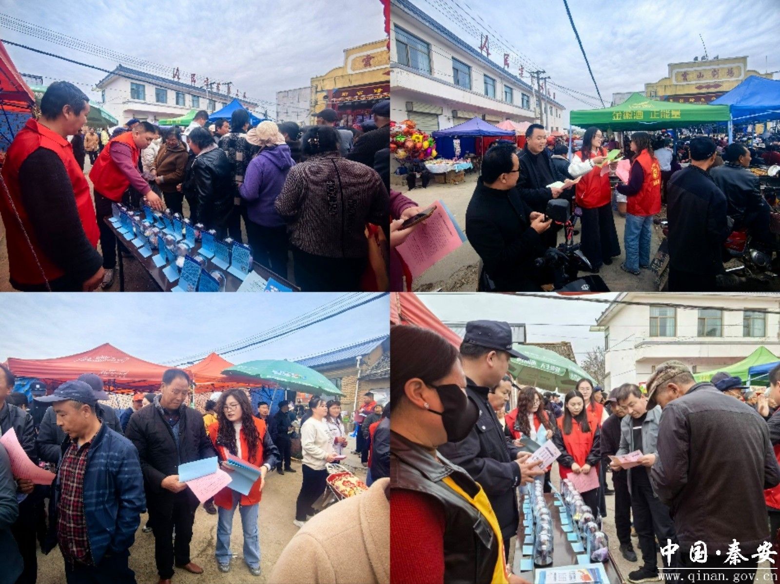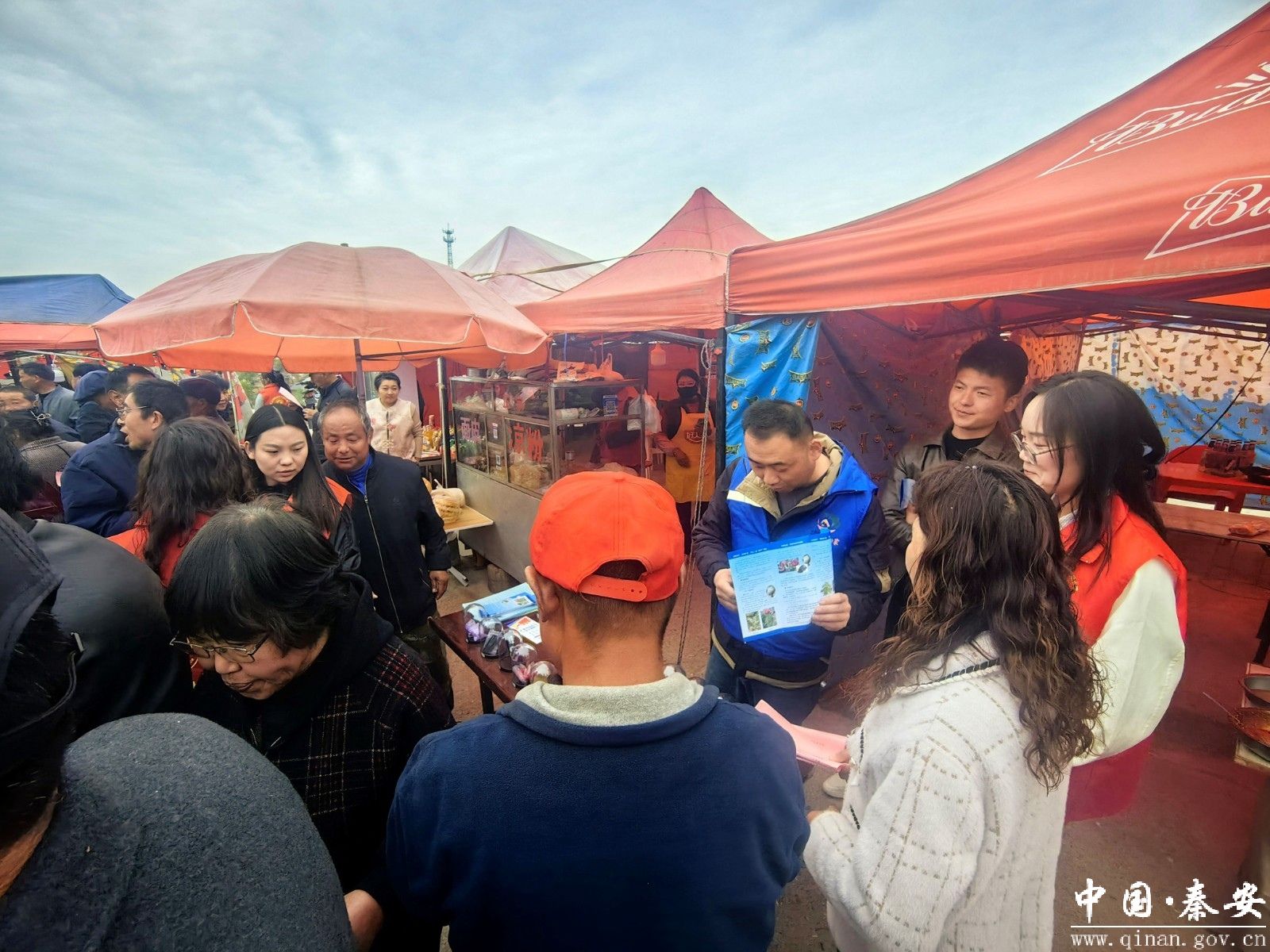 近日,云山镇传统庙会热闹开场,十里八乡的群众纷至沓来,秦腔高亢的唱腔在戏台上下回荡,现场人声鼎沸、烟火气十足。云山镇结合当前新时代文明实践重点工作,镇综治中心联合镇派出所、司法所等部门,组织工作人员和新时代文明实践志愿者抓住庙会人流密集、群众聚集的有利时机,将禁毒、国家安全、反电信诈骗和常态化扫黑除恶宣传融入民俗活动之中,在戏台旁、集市间摆起“宣传摊”,为热闹的庙会增添了一抹法治底色。
