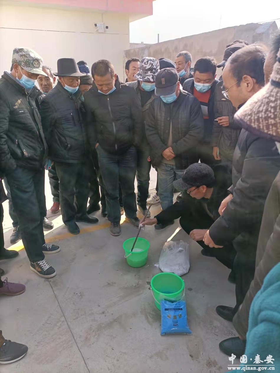 在秦安果业大讲堂走进刘坪活动中,果业局局长和技术人员就桃细菌性穿孔病群防群治进行了专题培训,会后果业局技术人员现场给果农指导演示了桃细菌性穿孔病防治药物波尔多液的配制比例和步骤。