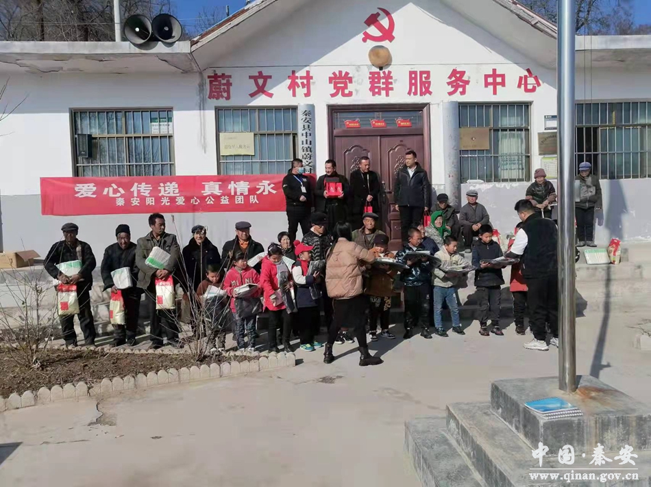 活动中,秦安县阳光爱心公益团队向蔚文村孤寡老人、特殊困难人员、学龄儿童分别捐赠了大米15袋、挂面15袋、学习文具、书包11套,帮助他们解决生活上的困难。