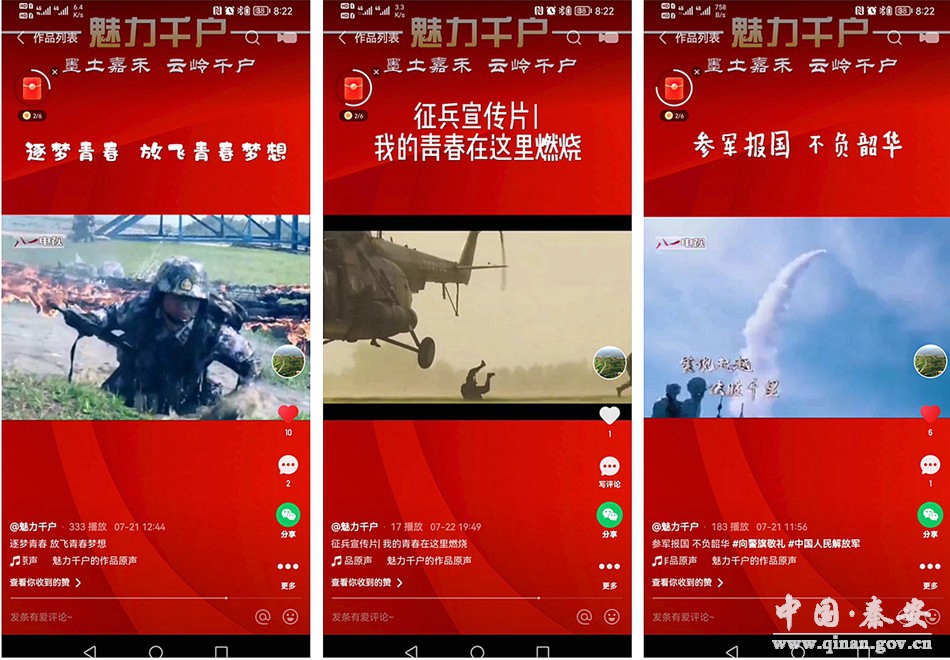 连日来,千户镇充分利用“魅力千户”抖音、快手号、微信公众号等新媒体平台和村级广播、微信群发布征兵宣传音视频,以及通村主干道的显眼位置悬挂宣传标语,在村公告栏张贴宣传公告,发放宣传册等方法,在全镇多形式开展征兵宣传,极大激发了广大青年的参军报国热情。