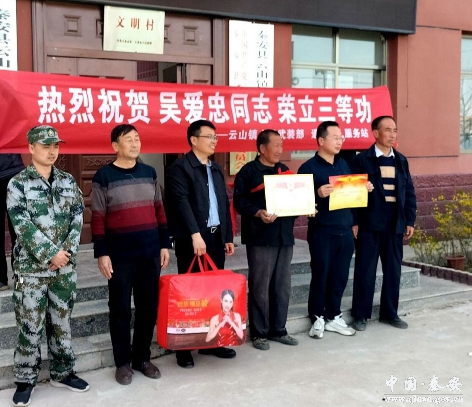 为进一步弘扬拥军优属优良传统,体现党和政府的关怀,营造全社会“崇尚功臣”的浓厚氛围,4月10日,云山镇人民武装部、退役军人服务站为荣立三等功的现役军人吴爱忠、崔鹏飞家属送去获奖喜报和慰问品,把党、政府和军队的关怀和温暖送到军属家中。