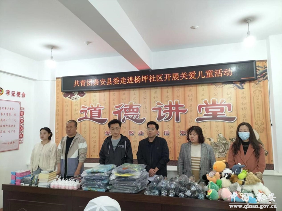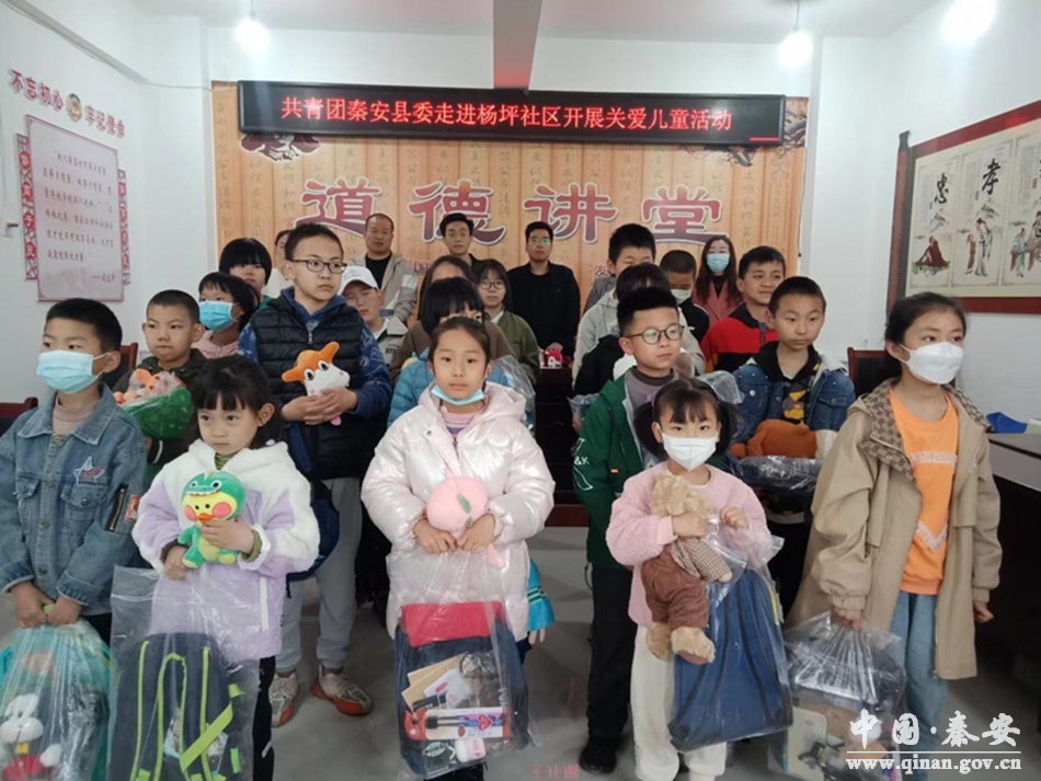 为进一步关爱辖区困境儿童的健康成长,呵护少年儿童心理健康,4月23日,共青团秦安县委走进杨坪社区开展关爱儿童活动,为孩子们送去了书包、杯子、文具、本子、毛绒玩具、防皴特润霜等慰问品。