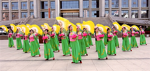 2.“蜡花舞”舞蹈动作很有特色,它独特的“八字步”“十字步”“平摆扇”“高挠扇”“平绕花”“高绕花”“慢着转”“快看”“凤凰三点头”等动作纯朴优美,彰显了东方女性含蓄内敛的特点和神韵,深受广大群众的喜爱。“蜡花舞”的表演形式随意自如,无论是在村头巷尾、家庭院落,还是舞台、广场都能表演,人数不限,少者4至8人,多者上百人组成舞蹈队。只见她们上身穿大襟滚边上衣,下身穿云边彩裙或色泽艳丽的百褶长裙。舞蹈队行进时步态轻盈,翻转穿插如蝴蝶飞舞;原地表演时,彩扇高绕平摆、花灯低落高托恰似花海起落……只见她们时而表现小脚女人走路步态的扭捏,时而表现在田间地头劳作的欢快。表演形式也具有多样化,可原地表演,也可在行进中表演;能单独表演,又能与其它社火如“舞狮”“旱船”“高跷”等一起配合表演,另有人扮成男女丑角,无拘无束穿插其中即兴做戏、风趣幽默、欢乐祥和古朴典雅,耐人回味。蜡花舞在它千年漫长的历史发展长河中,积淀了其特殊而独特的表演艺术风格。