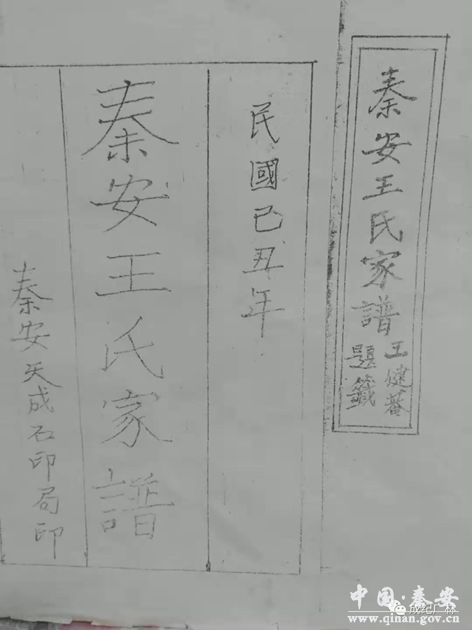 南关《王氏家谱》成书于民国38年(1949年)春,清末拔贡、礼部小京官王运乾(字健庵)题签,由秦安天成石印局印行。此谱为民国时期秦安县印行的最后一部家谱。