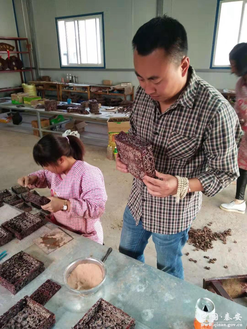 盯准了就要撸起袖子加油干。在陇城镇党委、镇政府的支持和帮助下,王小勇于2011年开办了生产山核桃工艺品的小作坊,开始招聘附近村民进行手工制作。很快,他就淘到了人生的第一桶金。随着产品需求量的增大,小作坊不能满足生产需求,2012年3月,他投资350万元注册成立了天水蓝途工艺品有限公司。公司成立后,生产规模逐渐扩大,原来的生产工具提高不了生产效率,于是,王小勇通过外出学习、参观、自学等方式,用两年时间逐步改进了生产工具和模具。生产工具更新了,人手不够,王小勇就将附近留守在家的60多名老人和妇女吸纳进来,手把手教他们制作工艺。