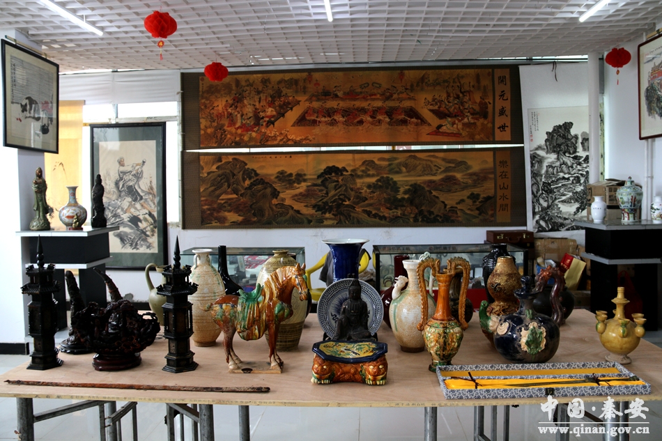 在展出现场,来自周边县区及本地的收藏爱好者还举办了古玩收藏展,展出了各个历史时期的陶器、玉器、铜器、书画和古钱币及杂项等文物。这是清水河地区个人民间珍贵藏品的首次集中展示,参观的人能够近距离观赏到民间收藏家的珍品收藏,也能让他们感受到当地深厚的历史文化底蕴。