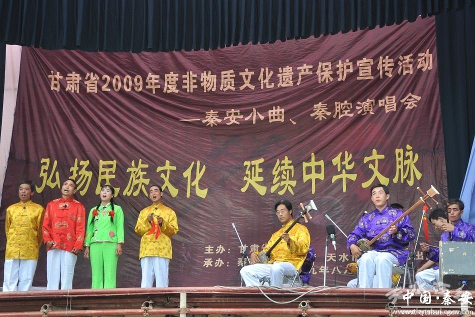 舞台很简陋,但与秦安小曲广泛流传的农家院落相比,已经是一个大舞台了。为了这天的演出,秦安县的小曲艺人们撂下地里的农活,带着三弦赶到了县城。秦安小曲演出队队长安治平介绍说:“来表演的都是秦安各乡镇优秀的小曲艺人,一共有80多人,他们带来了腊花舞、花调、老调等传统的秦安小曲演出。”