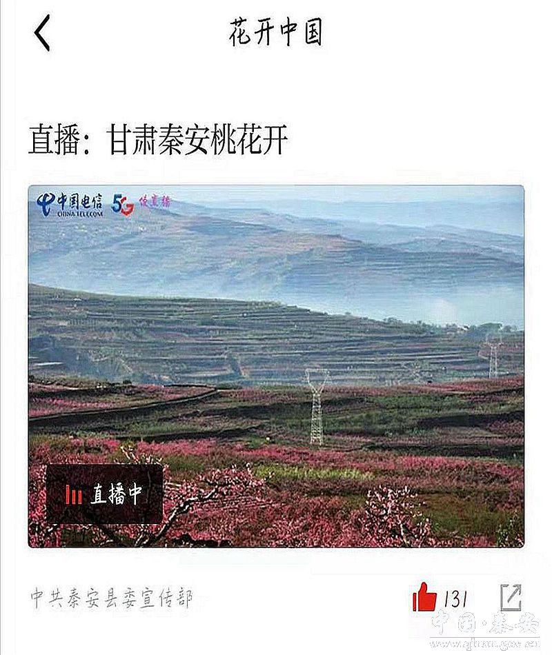 桃花春色暖先开,明媚谁人不看来。正值初春时节,秦安十万亩桃花竞相开放,四面八方的游客纷至沓来,赏花踏青。为了让全国网友一睹桃花的美好景色,近日,学习强国平台通过线上慢直播的方式,直播桃园美景,广大网友只要打开“学习强国”APP平台——“实播中国”栏目——“花开中国”频道便可足不出户领略秦安十万亩桃花竞相绽放的迷人景致!