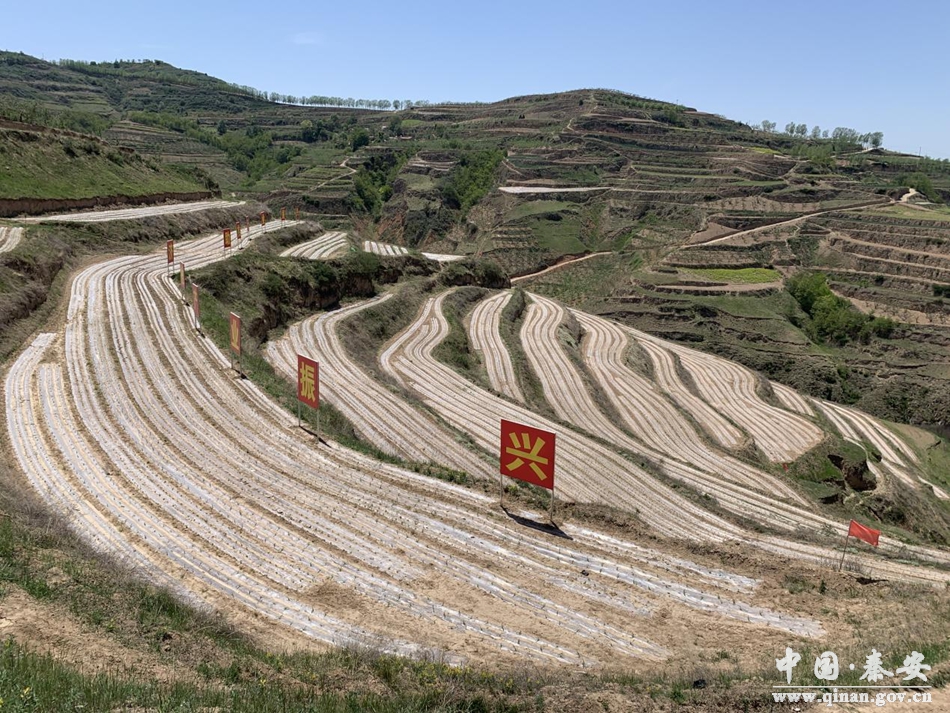 安伏镇位峰梁军山流域玉米大豆带状种植示范点位于位峰村、杨峡村高标准农田内,距镇区18公里,总面积500亩。走进示范基地,放眼望去,“山青地平”,层层梯田如雕如画,“玉米盖帽,大豆缠腰”。层层叠叠、高低错落,从山顶蜿蜒至山脚,壮观无比。