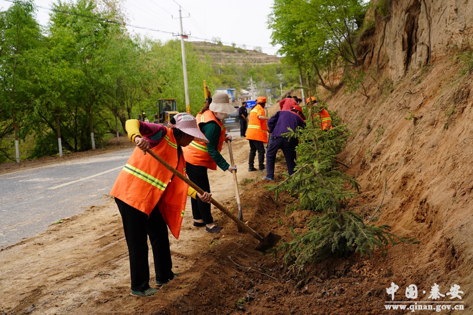 平整绿化带、修路、铺种草坪……,在王铺街道施工处,只见机器轰鸣,挖掘机、压路机来回穿梭,镇村干部、护林员和公益性岗位人员等头戴草帽、手拿铁锹,挖坑、栽树、平整路面,大家团结协作,干劲十足,现场一派热火朝天的劳动景象。