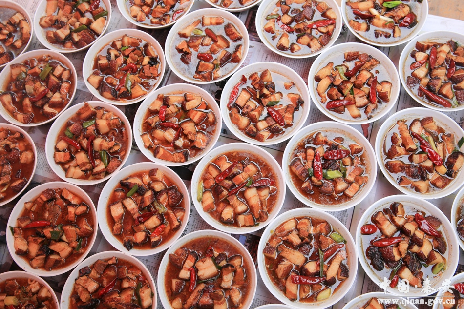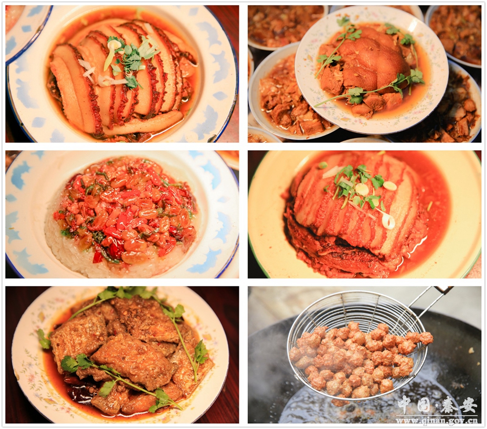 作为秦安传统的美食“八大碗”,深深扎根在一代又一代人的记忆中,不可磨灭。位于秦安县蔡林路的老安家,正是一家擅长八大碗制作的人家。走近老安家,一股肉香味便扑鼻而来,伴随着浓厚的料香味,令人食欲大振。从事八大碗制作多年的安亚军告诉记者,八大碗指的是扣肘子,扣排骨,黄焖鸡,糟肉,虾酱肉,十全丸子,八宝饭和香辣带鱼八道菜。之所以叫八大碗,是因为过去人们过年吃饭用的是八仙桌,四四方方,每个角上摆一道菜,七荤一素,是不可多得的美食。