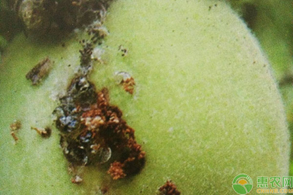 2、果实受害。夏秋季发生的幼虫主要蛀食果实,蛀果孔很小,多不明显,周围微凹陷。早期被害果面有较细虫粪排出,周围易变黑。晚期被害果外多无虫粪,后期幼虫蛀果后直达果核周围危害,将虫粪排于其中,形成“豆沙馅”,不能食用。幼虫脱果后,脱果孔处可导致果实腐烂。