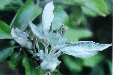 主要为害幼市或苹果树的嫩枝、叶片,也可为害芽、花及幼果。苗木染病后,顶端叶片和幼苗嫩茎产生灰门色斑块,如覆盖白色粉状物。发病严重时,病斑扩展土全叶,病叶萎缩,渐变褐色而枯死。新梢顶端被害后,展叶迟缓,抽出的叶片细长,呈紫红色,顶梢扭曲,发育停滞后。在病斑上,特别是在嫩茎及腋间,生出很多密集的黑色小粒点即病菌的闭囊壳。