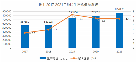 2021年,面对错综复杂的发展环境和艰巨繁重的改革发展任务,特别是新冠疫情和自然灾害影响,在县委、县政府的坚强领导下,全县上下坚持以习近平新时代中国特色社会主义思想为指导,认真贯彻党的十九大和十九届历次全会精神,认真贯彻落实习近平总书记对甘肃重要讲话和指示精神,坚持新发展理念,坚持稳中求进工作总基调,对标对表高质量发展,统筹推进常态化疫情防控和经济社会发展,继续扎实做好“六稳”工作,全面落实“六保”任务,全县经济社会发展稳中向好,各项社会事业蓬勃发展,“十四五”开局良好。 一、经济运行 【综合】 地区生产总值。根据地区生产总值统一核算结果〔1〕,2021年我县地区生产总值872092万元,同比增长6.4%,两年平均增长6.5%。其中,第一产业增加值为243768万元,同比增长10.6%,两年平均增长8.1%;第二产业增加值为82447万元,同比下降4.1%,两年平均增长2.1%;第三产业增加值为545877万元,同比增长6.4%,两年平均增长6.5%。全县人均地区生产总值达到21152元(按41.23万平均常住人口计算)。