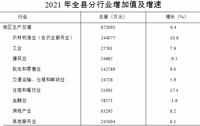 【工业】全县工业增加值27761万元,较上年增长7.9%。2021年全县共有规模以上工业企业10家,从业人员562人。规模以上工业总产值同比增长2.3%,其中轻工业产值同比增长11.2%,重工业产值同比下降19.4%;规模以上工业销售产值同比下降9%;规模以上工业增加值增长0.8%;规模以下工业增加值增长2.8%。
