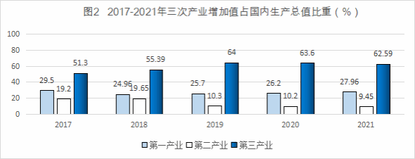 产业构成和贡献率。第一产业增加值占地区生产总值的比重为27.96%,较上年提升1.76个百分点;第二产业增加值占地区生产总值的比重为9.45%,较上年下降0.75个百分点;第三产业增加值占地区生产总值的比重为62.59%,较上年下降1.01个百分点。一、二、三产业结构比为27.96:9.45:62.59,对经济增长的贡献率分别为26.87%、9.16%和63.97%,分别拉动经济增长2.73、-0.42和4.09个百分点。
