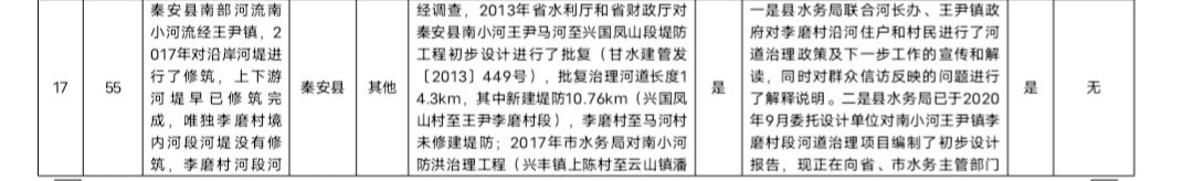 截止2021年7月12日,我市累计收到省第三生态环境保护督察组转来信访共8批105件。其中:市林草局(重点信访)1件,市水务局1件,秦州区47件(重点信访9件),麦积区18件(重点信访7件),甘谷县18件(重点信访6件),武山县3件(重点信访),秦安县7件(重点信访1件),清水县4件,张家川县6件。转办信访中重点信访27件,一般信访78件,已全部转交市林草局、市水务局、市住建局、市应急管理局、市生态环境局、市自然资源局等部门和相关县区办理。目前已办理上报52件,其中办结32件,阶段性办结16件,未办结4件。其余信访正在办理。