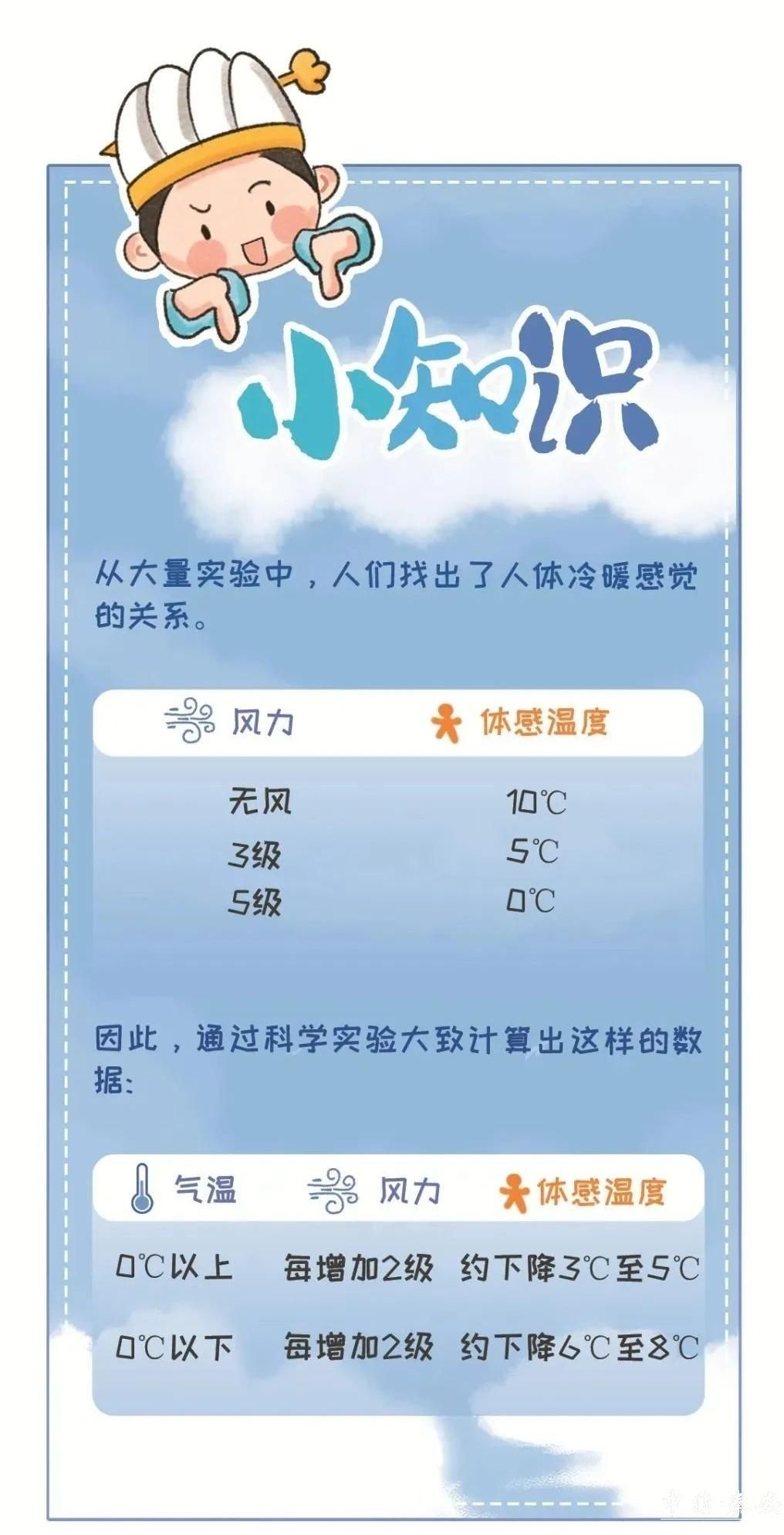 “被风吹得瑟瑟发抖”“冷风钻进胃里”成了这两天不少人的直观感受,但查看实际温度时,往往会比体感温度要高,这又是为什么呢?陈博宇表示,风寒效应是指风加速人体热量散失的现象。人体在无风时,周围会形成一层温暖的空气层,起到保温作用。但当有风时,这层空气被吹走,冷空气直接接触皮肤,加快热量流失,导致体感温度下降。风速越大,热量散失越快,体感温度越低。气温越低,风寒效应越明显。湿度高时,风寒效应更强,因为潮湿空气导热更快。