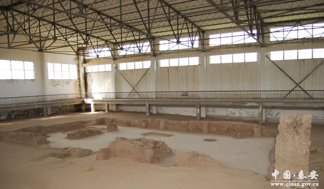 这是一座距今5000年的大型房屋遗址,座落在大地湾遗址的主体中心位置。1984年面世时,尽管已是一片废墟,但当年的门、柱、室、灶、墙、壁以及火塘却依稀可见。这是一座雄伟的建筑,是大地湾人的杰作。据研究,人们一致认为它就是当年的大地湾人聚集、会议、欢宴、歌舞的一个辉煌大厅。