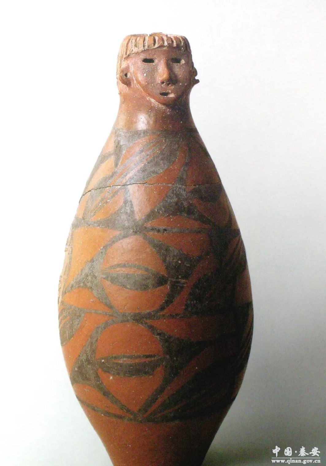 我虽没有一睹它的真容,但仅从照片上看,也足以让人感受到它的精美。我真怀疑它不是用来盛水或盛酒的普通容器,因为它真像是一只用来插花的花瓶。而凝视之下,我觉得它几乎就是一个理想中美丽的现代女性形象:容貌秀美,表情端庄,不卑不亢。她的发型,简直就是多年前流行的“杏子头”:额际的部分,剪得齐齐地,整个面部显得简洁,朴素,美观。又留着两绺掩耳的鬓角,很潇洒的样子,让人联想到日本电影《追捕》中的杜丘先生。她的嘴紧紧地抿着,嘴角生动有力,口里似乎永远含着一个什么有味的东西。她的眼睛正视着前方,小,却从容,也冷静,至少能传达秦安人自古以来的两种性格特点:狡黠,坚毅。我见过不少现在大地湾一带的人,他们的眼睛与眼神竟与这个出土文物的眼睛与眼神十分地相似。而最让人觉得美的是她的脖子,似乎她穿的是一件高领的棕色的毛衣,竖起的领子包裹了她的整个颈部,使她显得雍容大度,温润丰腴。瓶颈以下的瓶体花纹,竟是抽象的点线和面。布置停匀,疏而不旷,密而不滞——这真是一个冬天里穿着大花棉袄的女性,真是一个健康丰满的女性,真是自古以来秦安女性的一个美好的象征。