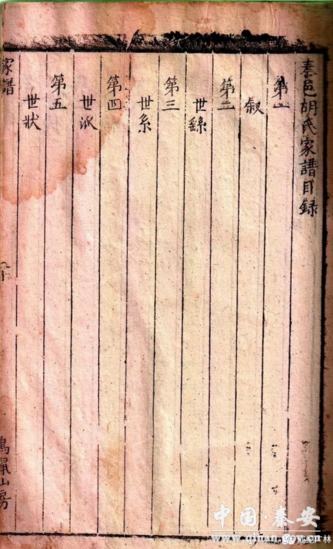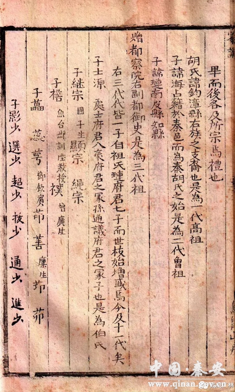 《秦邑胡氏家谱》《重修胡氏家谱》《胡氏二房家谱》记载内容均分为八大部分。第一部分为“叙”,叙述家谱编修过程及原由;第二部分为“世繇”,说明秦安胡氏的由来、发展情况;第三部分“世系”,详实地考证秦安胡氏从始祖二代胡海到以后各代及其分支的演变情况;第四部分“世派”,详述秦安胡氏各代及分支主要人物的行业和职位、荣誉及基本情况;第五部分“世状”,对秦安胡氏家族各代的生、娶、寿、卒、葬等进行详实记述;第六部分“世传”,对胡氏家族各代名人进行立传简介;第七部分“外传”是对胡氏匹配及女氏之卓所立的小传;第八部分“说”,陈述作谱之义,以训诸子。