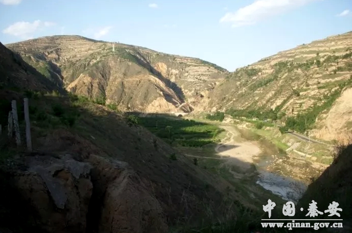 出秦安城北门,沿着华双公路北上,依次是郊区三里铺、十里铺。沿途楼房栋栋,房舍青青,果蔬片片。大约行程10里后,从宁夏西吉月亮山启程的葫芦河宛如一条金黄的玉带漂浮在身旁,让视野立马变得狭窄起来,,两边黑黝黝的石山俨然扼守在葫芦河两旁。隔河是西面的黑龙山,紧贴身旁的是青龙山(唐帽山)。行至此处,眼前的峡谷地带被称为锁子峡。