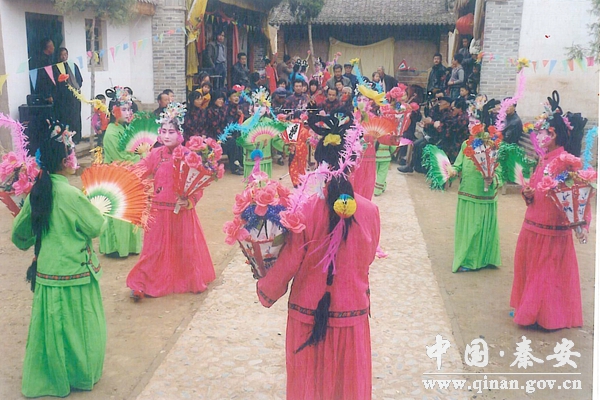 秦安蜡花舞是形成并主要流行于甘肃东南天水市秦安县境内的古老的舞蹈艺术。据近4800——7800年大地湾遗址f411地画,可以说是舞蹈的雏形。秦安蜡花舞真正形成于唐宋时期,距今已有1000余年历史。秦安为古成纪地界,素有“羲里娲乡”之称,不仅是“人文始祖”羲皇、女娲的故里,而且是诗仙李白、飞将李广、唐王李世明、名相权德舆的祖籍。闻名中外的“大地湾遗址”的发掘证实,这里有着悠久的文明,文化底蕴十分丰厚,是中华民族发祥地之一。蜡花舞源于词赋艺术,为了增强词赋的情感表达,配以人体的舞蹈动作。这种舞蹈在夜间演出,表演者左手托着花灯,花灯内装有点燃的蜡烛,右手挥着丝折扇,所以叫做蜡花舞。