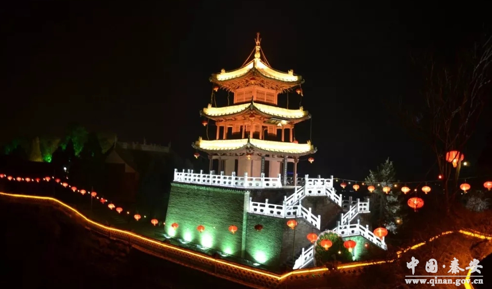 九龙山自高峰趋赴县东,悠然而集,翩翩若凤,此即凤山,民间俗称泰山庙。又因山上多庙宇,故又称庙山。明嘉靖以前就建有天齐庙、天齐堡,清乾隆间知县蒋允焄主持修建蓬莱阁,一时成为秦安标志性建筑。现存庙宇多为明清建筑,建在拾阶而上的九个平台上,分一阁、一宫、二洞、三厅、五厦、六山门、二十四殿宇,布局精巧,错落有致,斗拱咬合精细,彩绘绚烂,既富于变化,又浑然一体。属于中国古典庭院园林建筑风格。