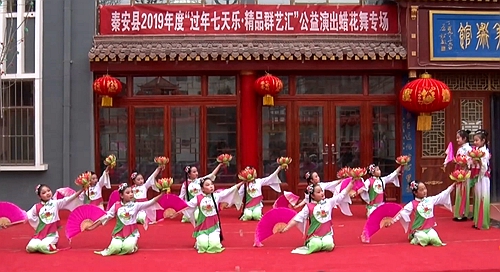 2.“蜡花舞”舞蹈动作很有特色,它独特的“八字步”“十字步”“平摆扇”“高挠扇”“平绕花”“高绕花”“慢着转”“快看”“凤凰三点头”等动作纯朴优美,彰显了东方女性含蓄内敛的特点和神韵,深受广大群众的喜爱。“蜡花舞”的表演形式随意自如,无论是在村头巷尾、家庭院落,还是舞台、广场都能表演,人数不限,少者4至8人,多者上百人组成舞蹈队。只见她们上身穿大襟滚边上衣,下身穿云边彩裙或色泽艳丽的百褶长裙。舞蹈队行进时步态轻盈,翻转穿插如蝴蝶飞舞;原地表演时,彩扇高绕平摆、花灯低落高托恰似花海起落……只见她们时而表现小脚女人走路步态的扭捏,时而表现在田间地头劳作的欢快。表演形式也具有多样化,可原地表演,也可在行进中表演;能单独表演,又能与其它社火如“舞狮”“旱船”“高跷”等一起配合表演,另有人扮成男女丑角,无拘无束穿插其中即兴做戏、风趣幽默、欢乐祥和古朴典雅,耐人回味。蜡花舞在它千年漫长的历史发展长河中,积淀了其特殊而独特的表演艺术风格。