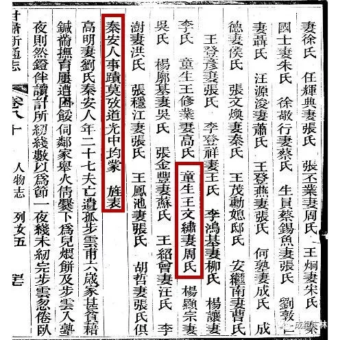 ……童生王文绣妻周氏……俱秦安人,事迹莫考,道光中均蒙旌表。